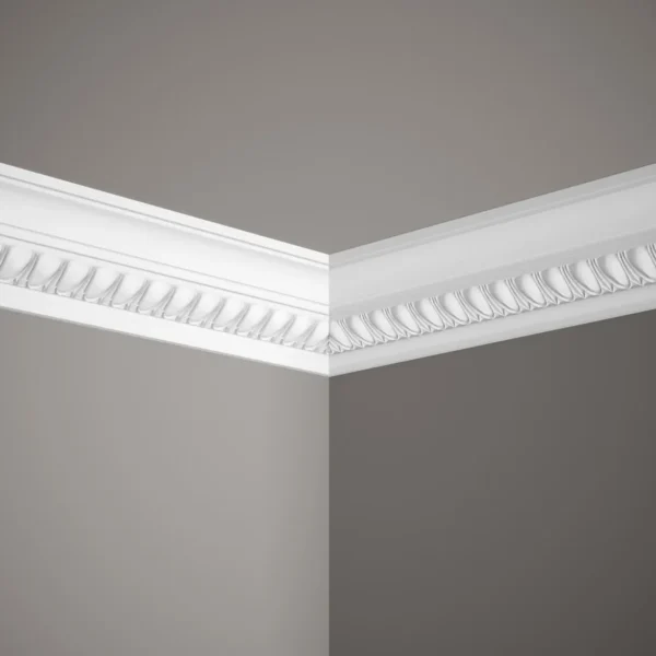 Cornișă pentru tavan MDA040 este un profil decorat, cu dimensiuni mai mari. Deși are o înălțime de 13,5 cm, cornișa este ușoară și extrem de simplu de instalat. Este suficient să aplici adeziv pe marginile superioare și laterale ale profilului și să o fixezi pe perete.