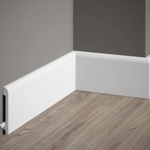 Plinta este finisată din fabrică cu un grund special care asigură o suprafață netedă, protejată și pregătită pentru aplicarea ulterioară a straturilor de vopsea. Pentru un efect vizual perfect, recomandăm utilizarea unei vopsele pe bază de apă după instalare.