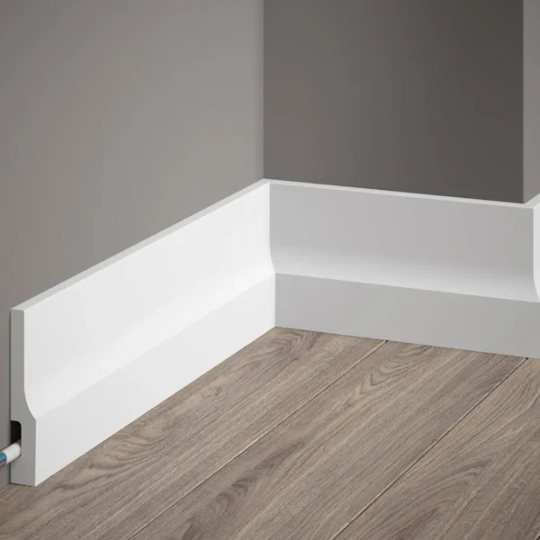 Plinta premium QS011 este un profil modern cu o formă originală. Un design special pe spatele plintei permite ascunderea cablurilor, eliminând astfel efectul cablurilor inestetice care se trag pe podea. Suprafața plintei este acoperită din fabrică cu un strat exclusiv SupremeSatin, care conferă plintei un finisaj satinat exclusivist. O plintă pregătită astfel este, atât vizual, cât și din punct de vedere al utilizării, un produs de top în domeniul produselor de finisaj interior.