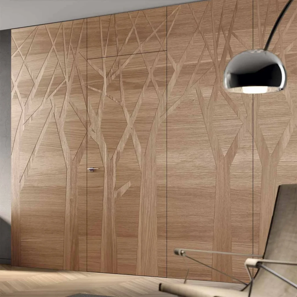 Foaia de ușă este acoperită cu furniruri din lemn de calitate, disponibile în trei opțiuni de dispunere a fibrelor: vertical (CL), orizontal (DOGA HORI) sau orizontal cu benzi verticale (DOGA). Structura tamburată include un cadru perimetral de 50 mm din lemn masiv italian, iar interiorul este realizat din material kraft reciclat 100%, presat la cald și combinat cu MDF certificat IDRO, CARB și FSC®.
